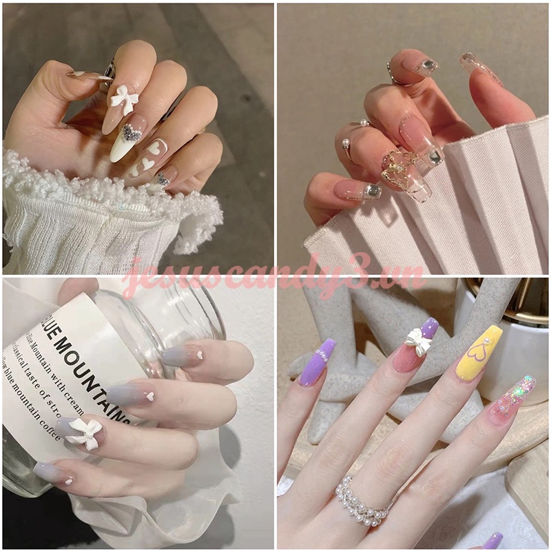 Bộ 24 Móng Tay Giả Màu Trắng Hồng Đính Đá Trang Trí Thời Trang Kèm Keo Dán / móng tay giả kèm keo free ship